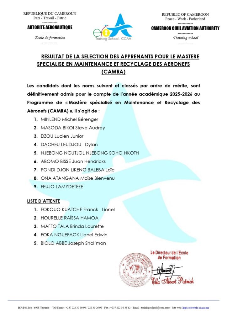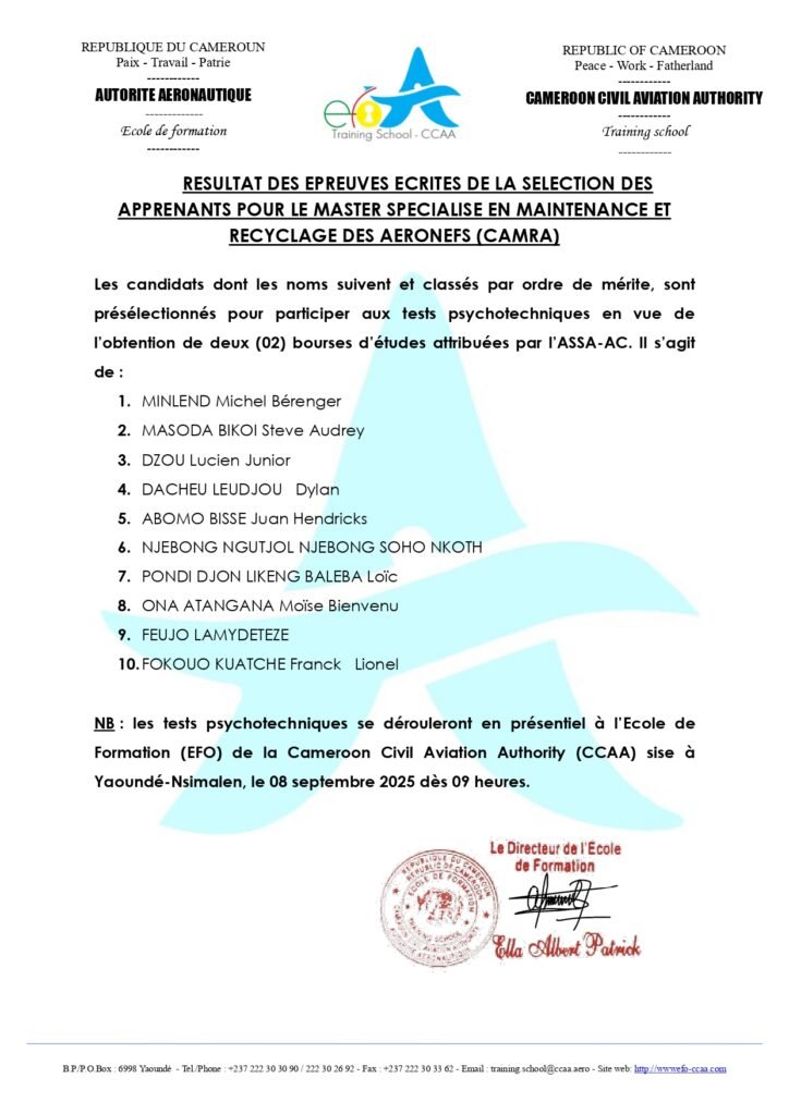 RESULTAT DES EPREUVES ECRITES DE LA SELECTION DES APPRENANTS POUR LA LICENCE EN EXPLOITATION DES SERVICES DE LA NAVIGATION AERIENNE ET D’AERODROME (ESNAA)